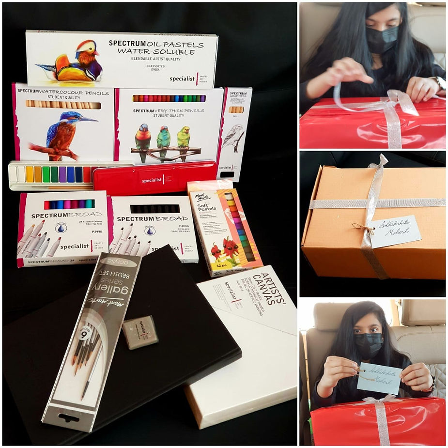 2-3 months later, there was another mail which made me walk on air. It said that I was given a bronze ranking for my Toyota Organo and was invited to the awarding ceremony on the coming Saturday! I was so excited but the thing was I had to wait for 3 whole days! If you know me, you would know how restless I was. The next 3 days went like forever when I was thinking about the awarding ceremony and time used to go like jets when I was not thinking about it. Finally, that day came, and I was supposed to be there by 2:30 pm, it was 12:00 now so I had time to try a bunch of dresses. When I was okay with one, my dad had come to pick us and go to the Toyota showroom. I got in the car and drove off. I saw many things, even a well-behaved sparrow sitting on a signal! We reached the Toyota showroom and we met my uncle there, he told us he would be there the day before so we went together. There was barely space for us to park as there were pre-owned, newly made and owned cars all around the place. I entered the showroom and we asked the security where to go, we went as directed. It was downstairs. There were many red boxes with artworks of the winners and the stage looked like a blue car that had drops of colour that made it look like a paint pallet. I got down there and 2 people talking with another person and a boy. We waited until they were done and we went to the area. I told them my name and they asked me if I was ready, I said yes. They gave me a big red box for me to hold, they had photographers and even my family was taking the pictures. They said they would send the photos by mail and they would send my art framed to my house. We said thank you and I took the red box. I was thinking about medals, so why was a medal taking much more space than it was supposed to? I got to the car and opened it right then, what was inside was not a medal but a bunch of art sets! It was so many of them. I know that you might be curious to know what are the things I found inside the box, so this is the picture of the things I got.